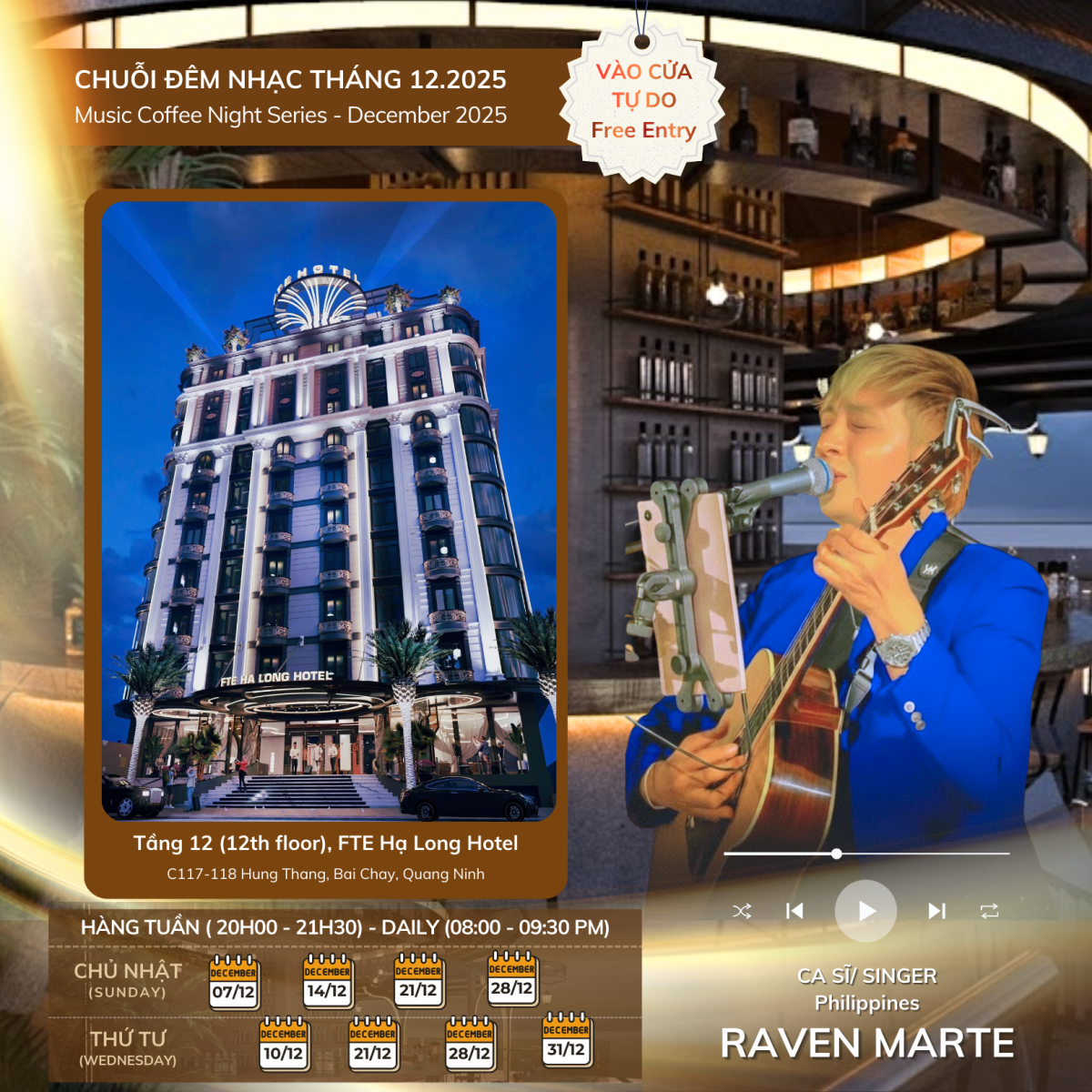 FTE Ocean Sky Bar trân trọng giới thiệu chuỗi Minishow định kỳ vào mỗi Thứ Tư và Chủ Nhật hàng tuần, mở cửa hoàn toàn miễn phí dành cho tất cả du khách và người dân Hạ Long. Đây là điểm hẹn lý tưởng để thư giãn, thưởng thức đồ uống và tận hưởng âm nhạc live giữa không gian rooftop tầng 12, nơi bạn có thể ngắm trọn vẹn vẻ đẹp lung linh của thành phố biển về đêm.