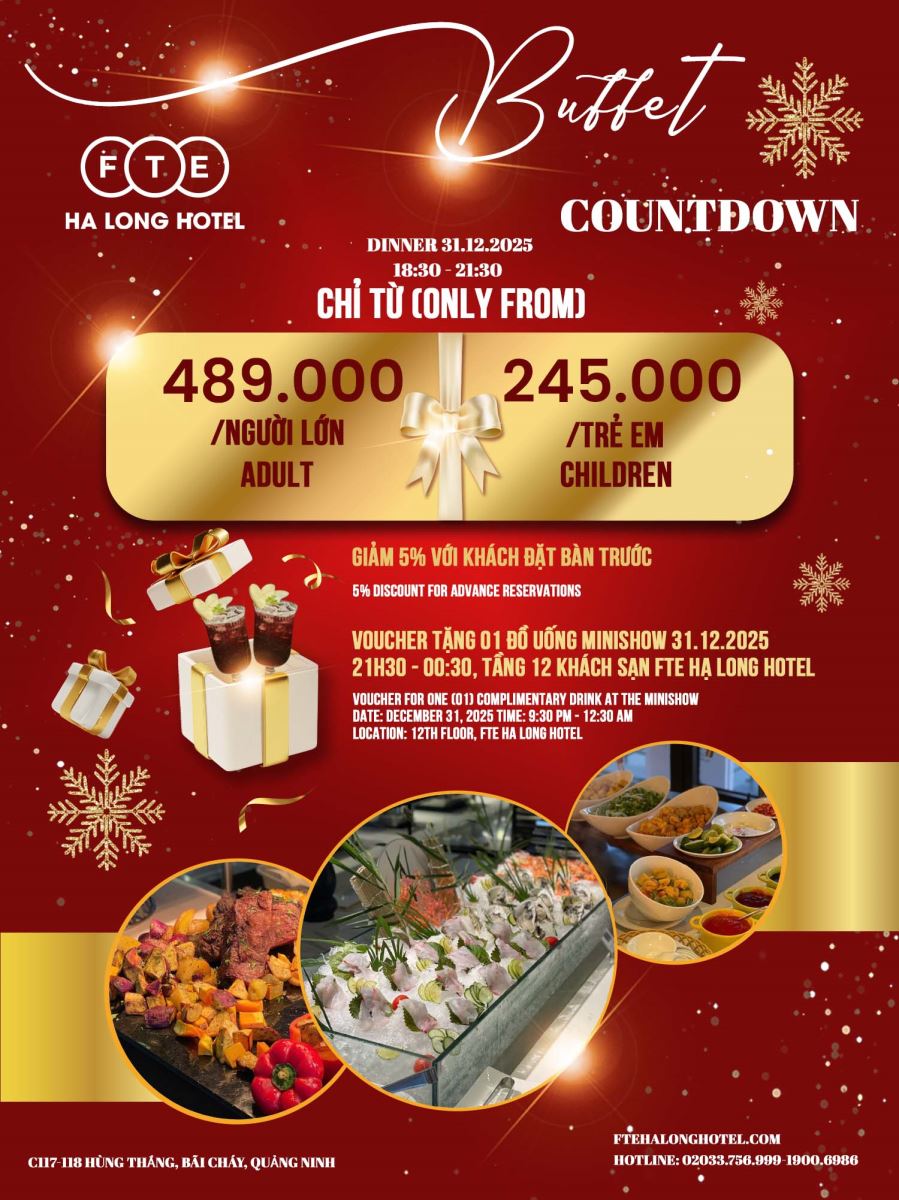 Khách tham dự buffet sẽ nhận ngay 01 đồ uống miễn phí tại Minishow Countdown, sự kiện mở cửa tự do diễn ra tại FTE Ocean Sky Bar – tầng 12 từ 21:30 ngày 31.12.2025 – 00:30 ngày 01.01.2026.