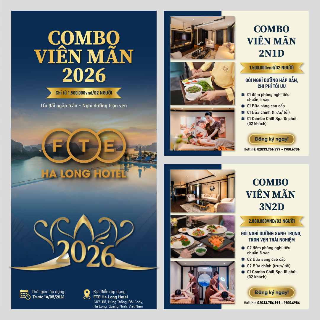 Bước sang năm 2026, FTE Hạ Long Hotel chính thức giới thiệu Combo Viên Mãn 2026 – ưu đãi nghỉ dưỡng hấp dẫn dành cho những ai đang tìm kiếm một kỳ nghỉ trọn vẹn, thư thái bên bờ di sản thiên nhiên thế giới Vịnh Hạ Long.