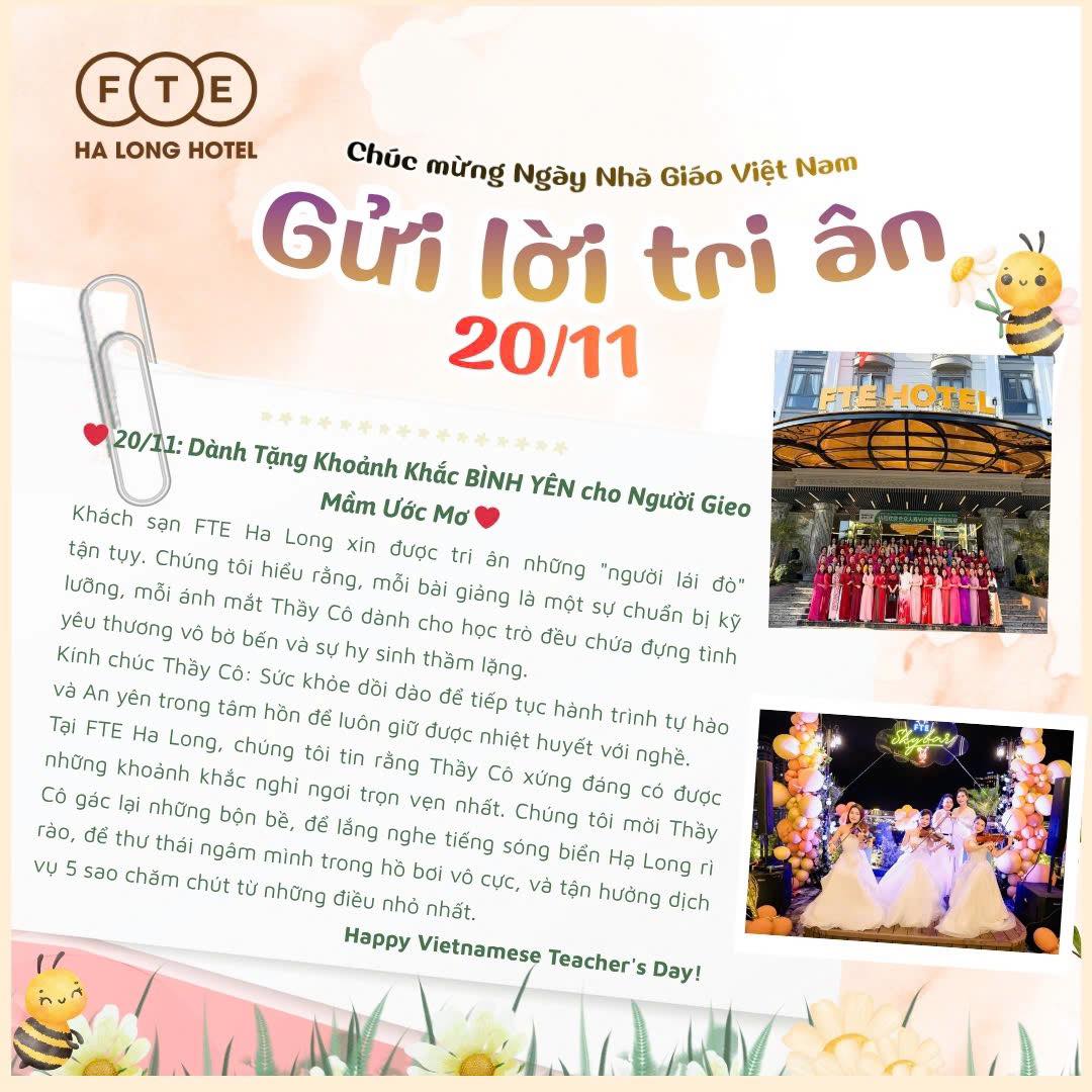 🌸 Nhân dịp kỷ niệm Ngày Nhà giáo Việt Nam 20/11, FTE Hạ Long Hotel xin gửi tới Quý thầy giáo, cô giáo trên khắp cả nước lời chúc mừng nồng nhiệt và lòng biết ơn sâu sắc nhất.